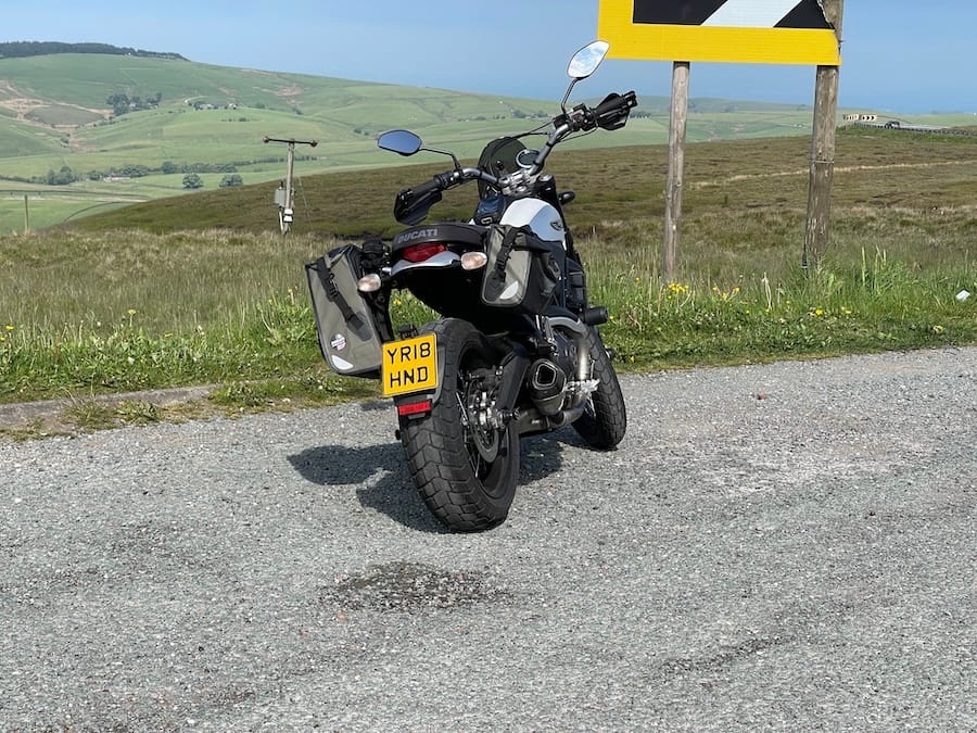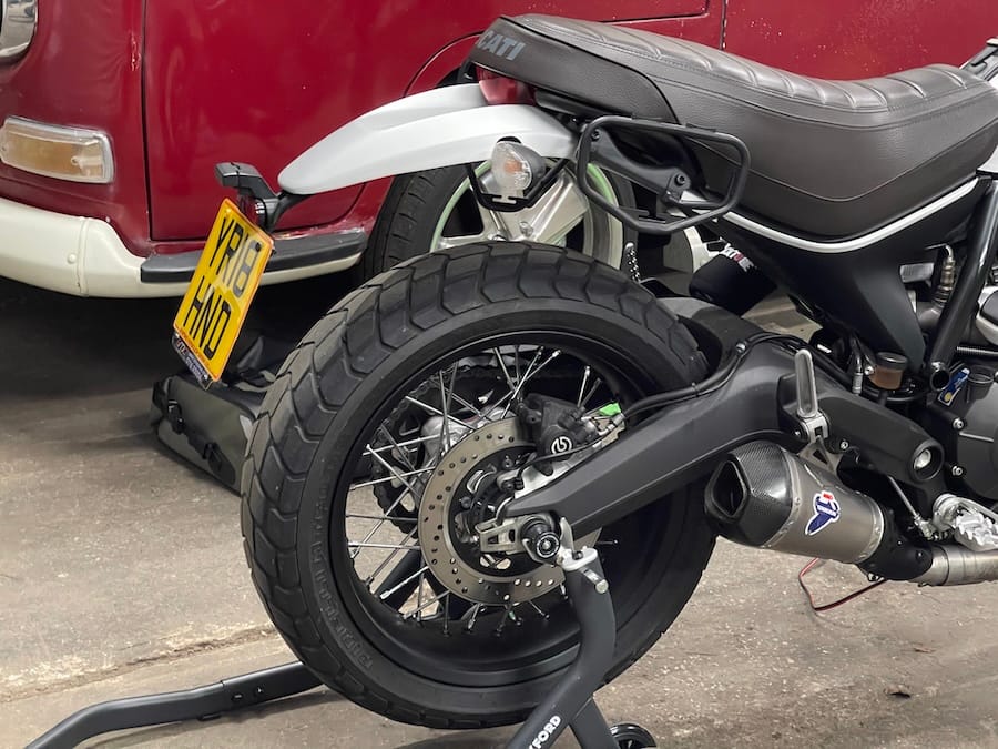 The plate is their 6.5 x 6.5 Motorcycle Pressed Novelty Plate, available here - it's close to the same width of the rear tyre so looks great in my opinion. This is not a legal plate in the UK so I am taking my chances a little but it's the correct font, it's yellow and it's not teeny tiny so hopefully...